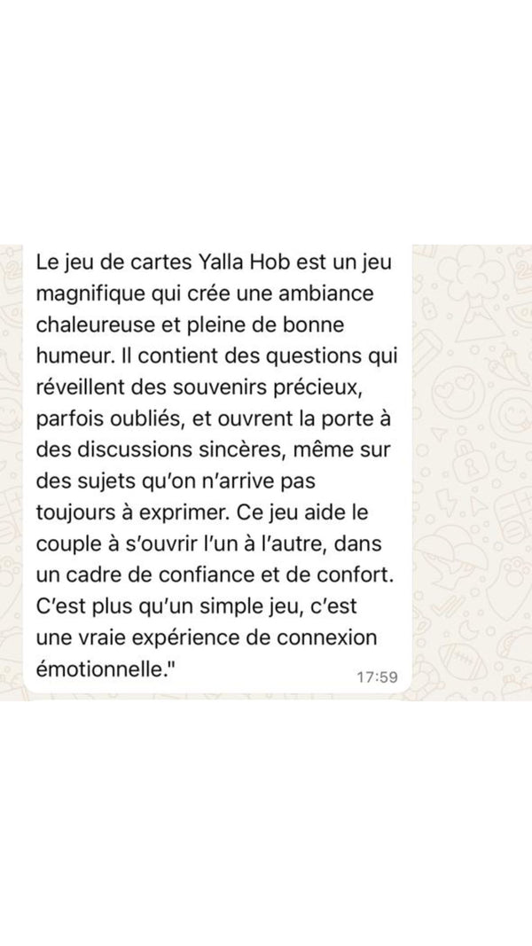 ما بين الخدمة، التوتر، والروتين... العلاقة تستحق نفس جديد. "يلا حب" موش مجرد لعبة، هي عادة يومية ترجع الدفء، الحوار، والضحكة للعلاقة. بطاقات ذكية، مكتوبة بعناية، تعيشوا معاها لحظات قُرب حقيقية.